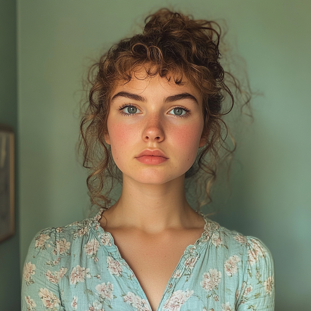 Una joven pensativa de pie en un salón | Fuente: Midjourney