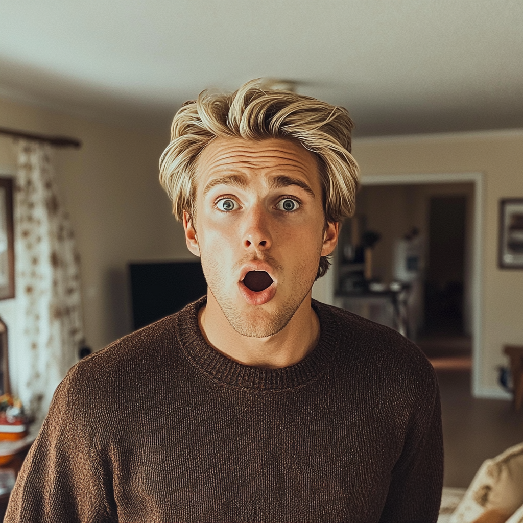 Un hombre conmocionado de pie en una sala de estar | Fuente: Midjourney
