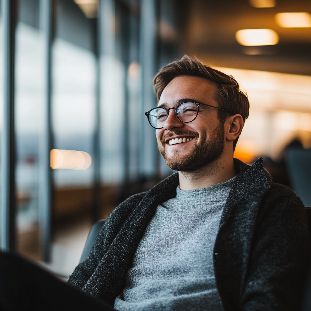 Un hombre sonriente mirando a la cámara en un aeropuerto | Fuente: Midjourney