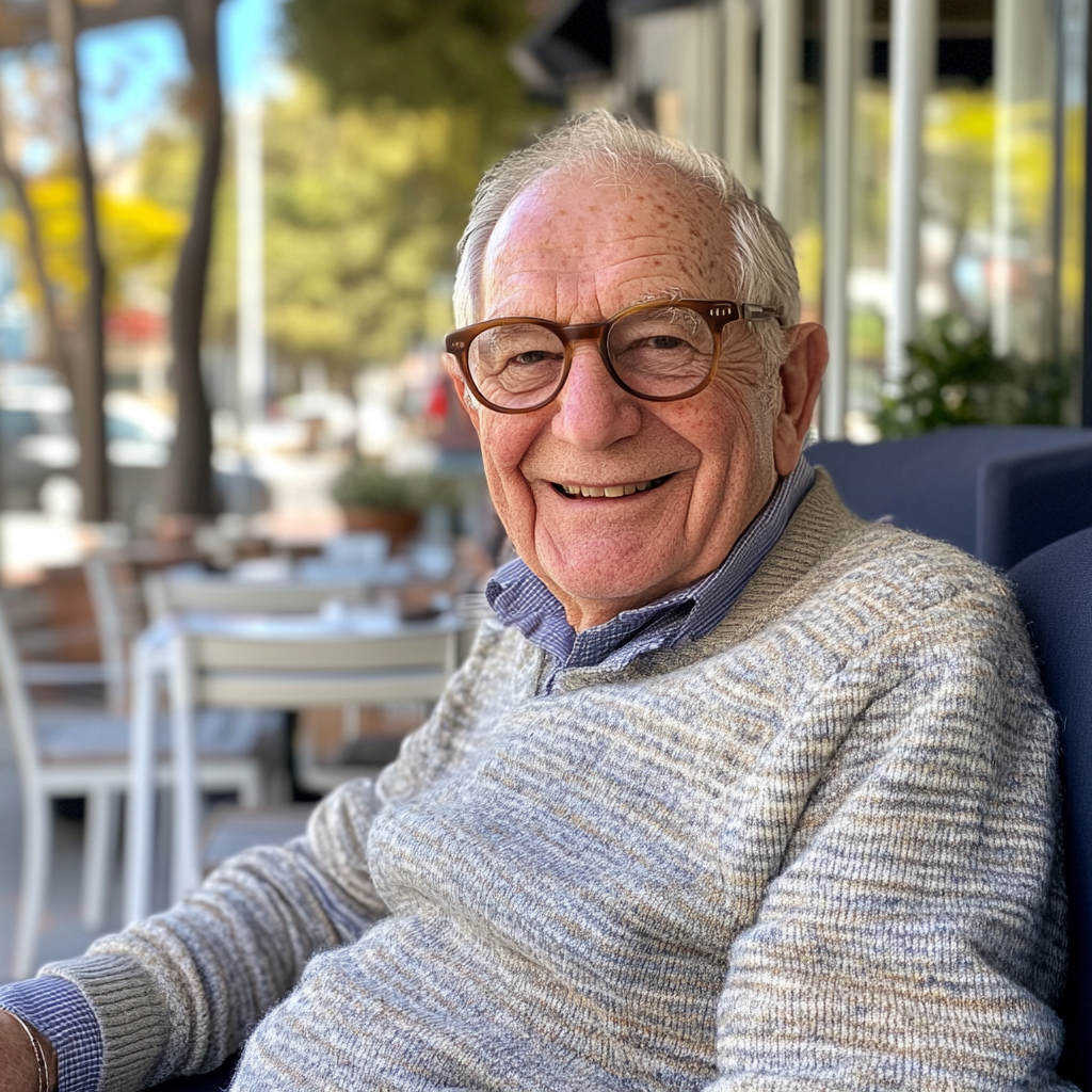 Un anciano sentado en la puerta de una cafetería | Fuente: Midjourney