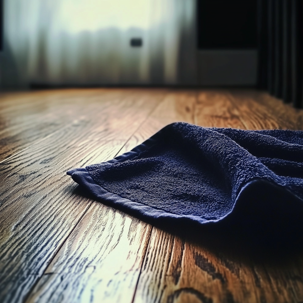 La esquina de una toalla azul marino en el suelo | Fuente: Midjourney