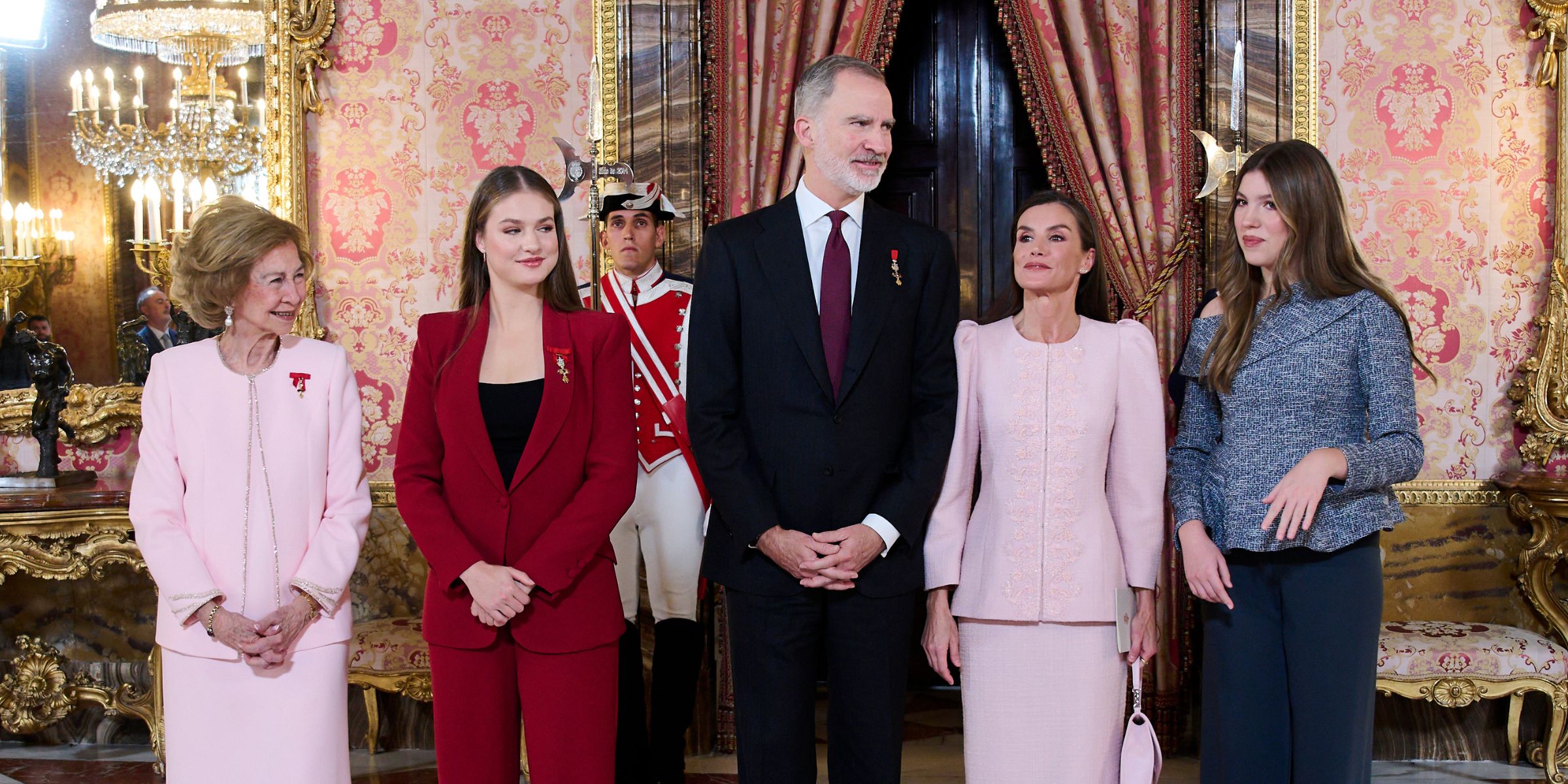 En esa escena, la reina Letizia y Leonor están sentadas y sonrientes, mientras que el rey Felipe abraza con ternura a Sofía. La composición transmite proximidad entre los miembros y la familiaridad de un momento real compartido fuera del estricto ceremonial.