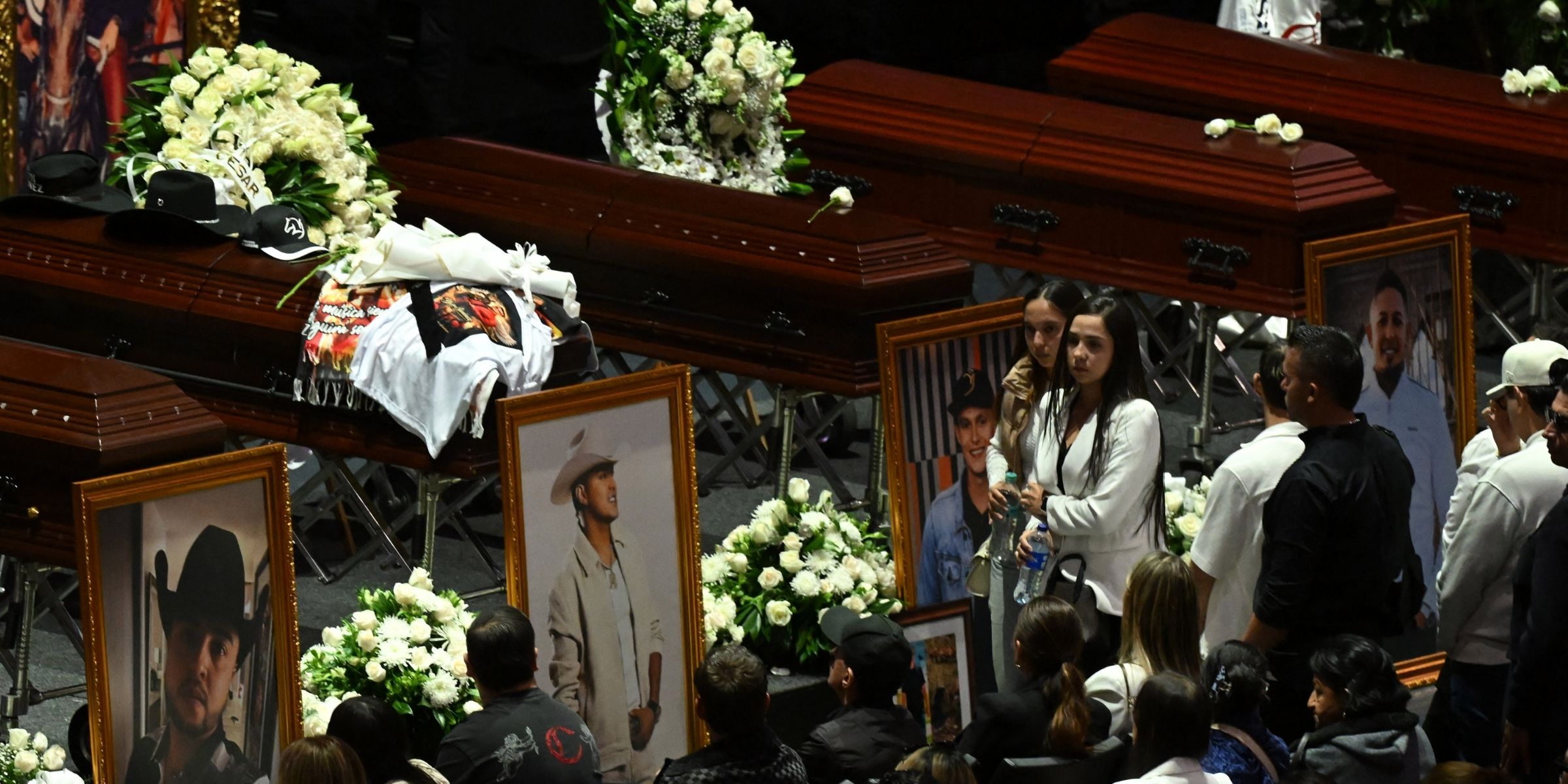 El escenario y los ataúdes: flores, fotos y despedidas silenciosas
