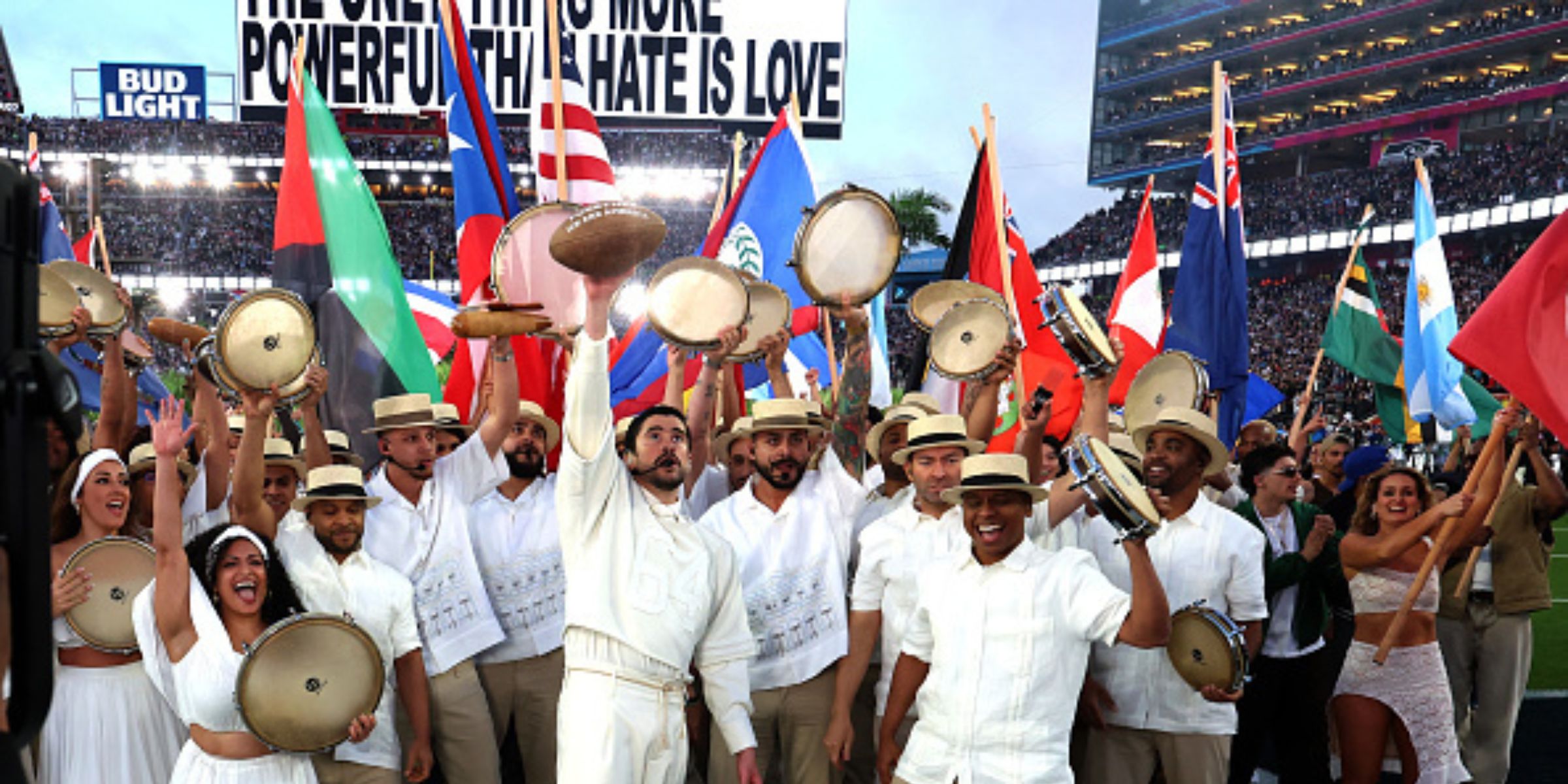 Se muestra un mensaje mientras el cantante puertorriqueño Bad Bunny se presenta durante el show de medio tiempo de Apple Music del Super Bowl LX entre los Patriots y los Seahawks, en el Levi’s Stadium de Santa Clara, California, el 8 de febrero de 2026: "Lo único más poderoso que el odio, es el amor", en español | Fuente: Getty Images