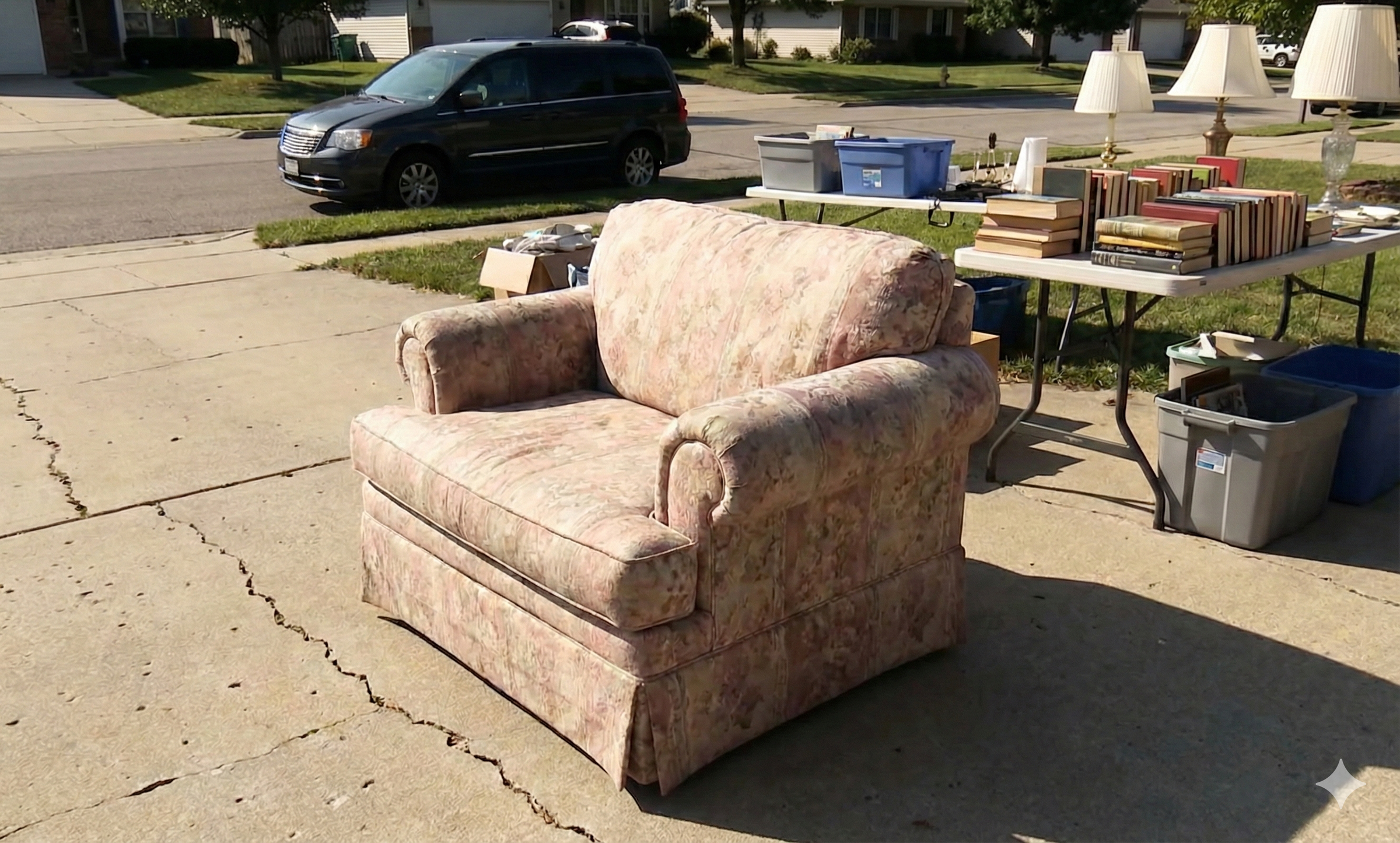In una svendita, incastrata tra giocattoli di plastica e una pila di romanzi d'amore, c'era una poltrona oversize con fiori sbiaditi e braccioli spessi.