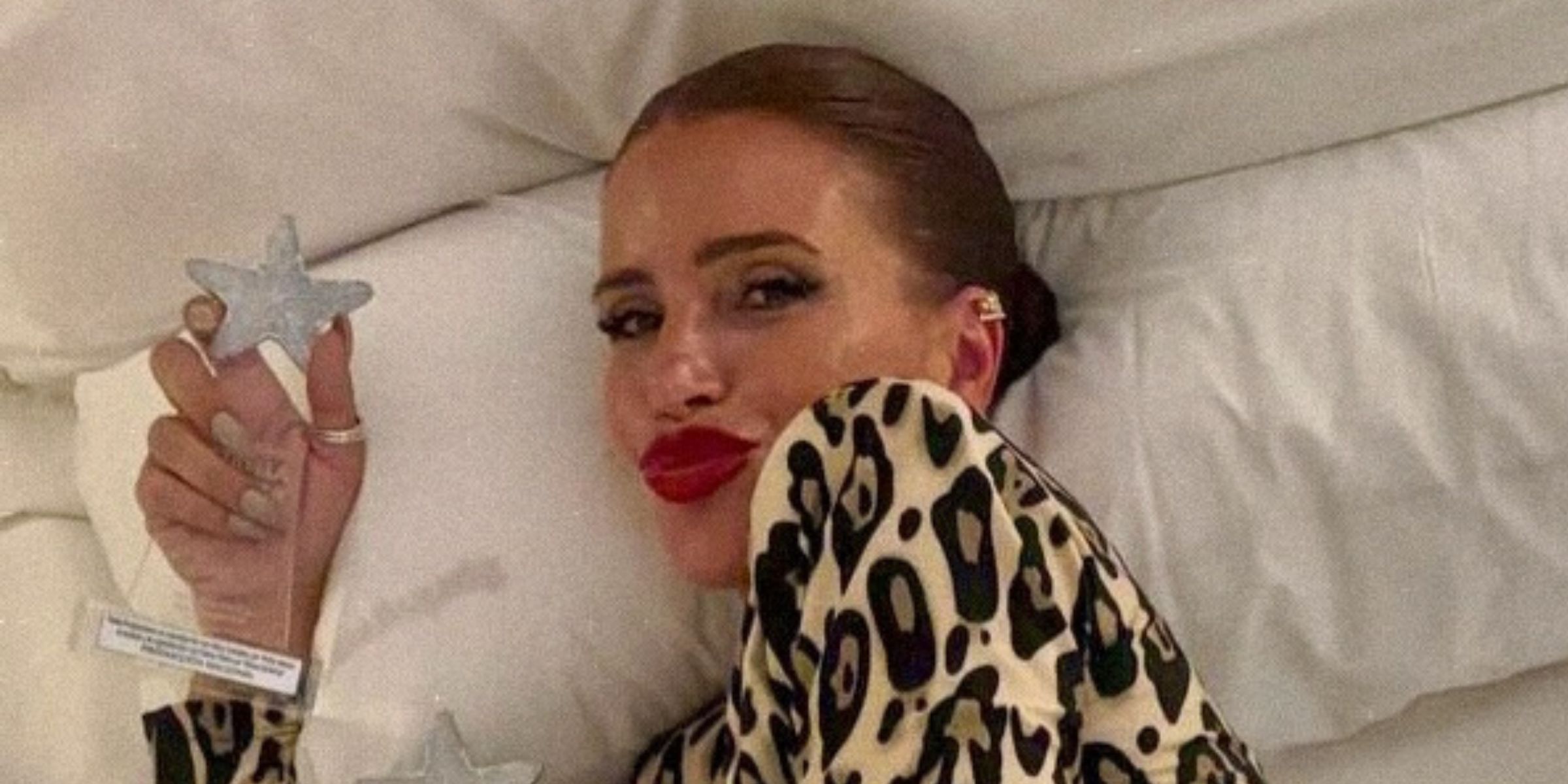 En las postales se la ve luciendo una bikini blanca de dos piezas. La parte superior es un top tipo triángulo con tirantes finos y una pequeña abertura en el centro del busto. La parte inferior es de tiro bajo, con tiras finas a los costados que se ajustan con lazos.