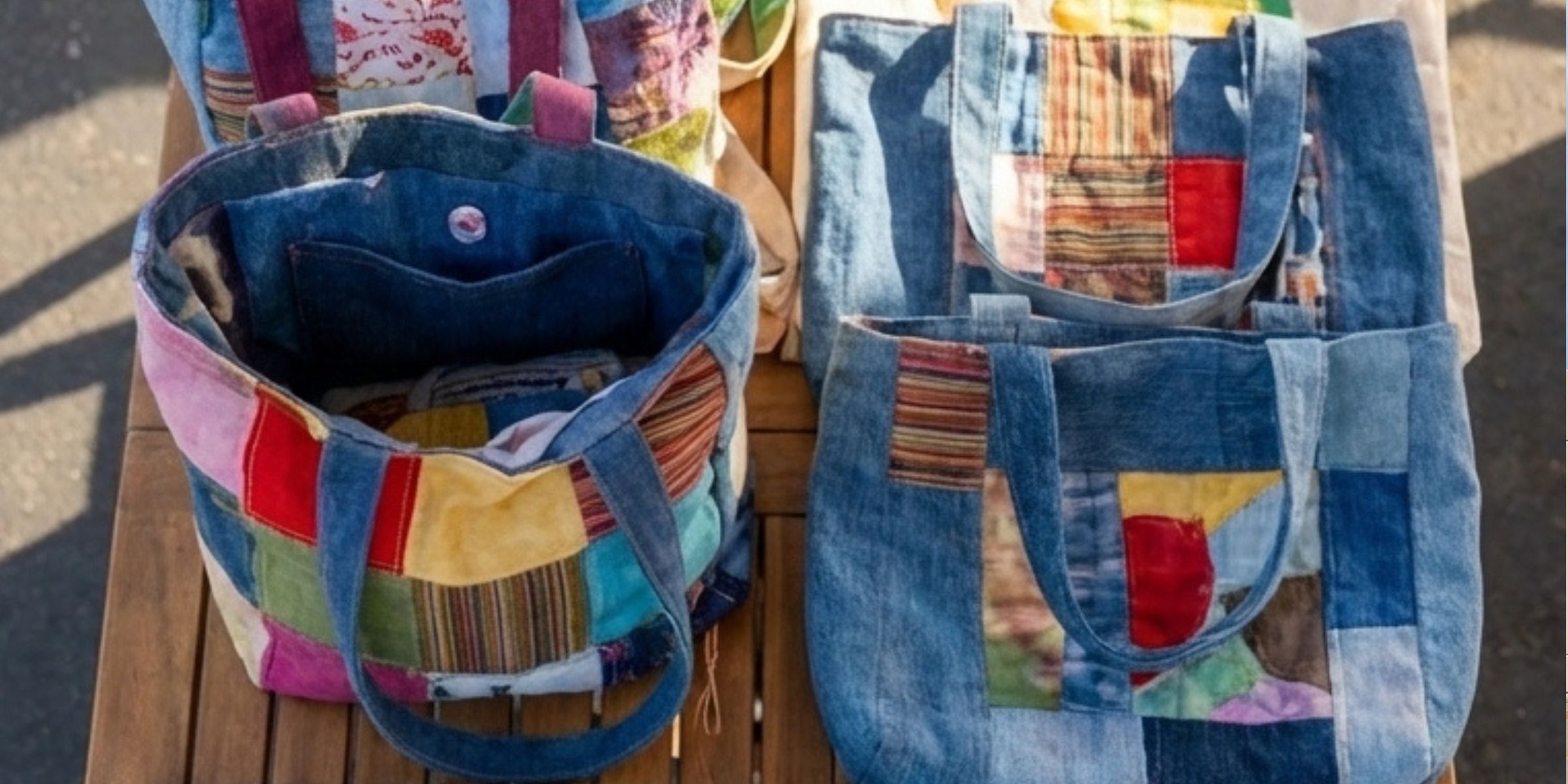 Il tavolo di Ava era vicino all'ingresso. Aveva disposto 21 borse in due file ordinate, con un piccolo biglietto scritto a mano che recitava: "Realizzate con tessuti donati. Tutti i proventi sono destinati alle raccolte di abbigliamento invernale! :)"