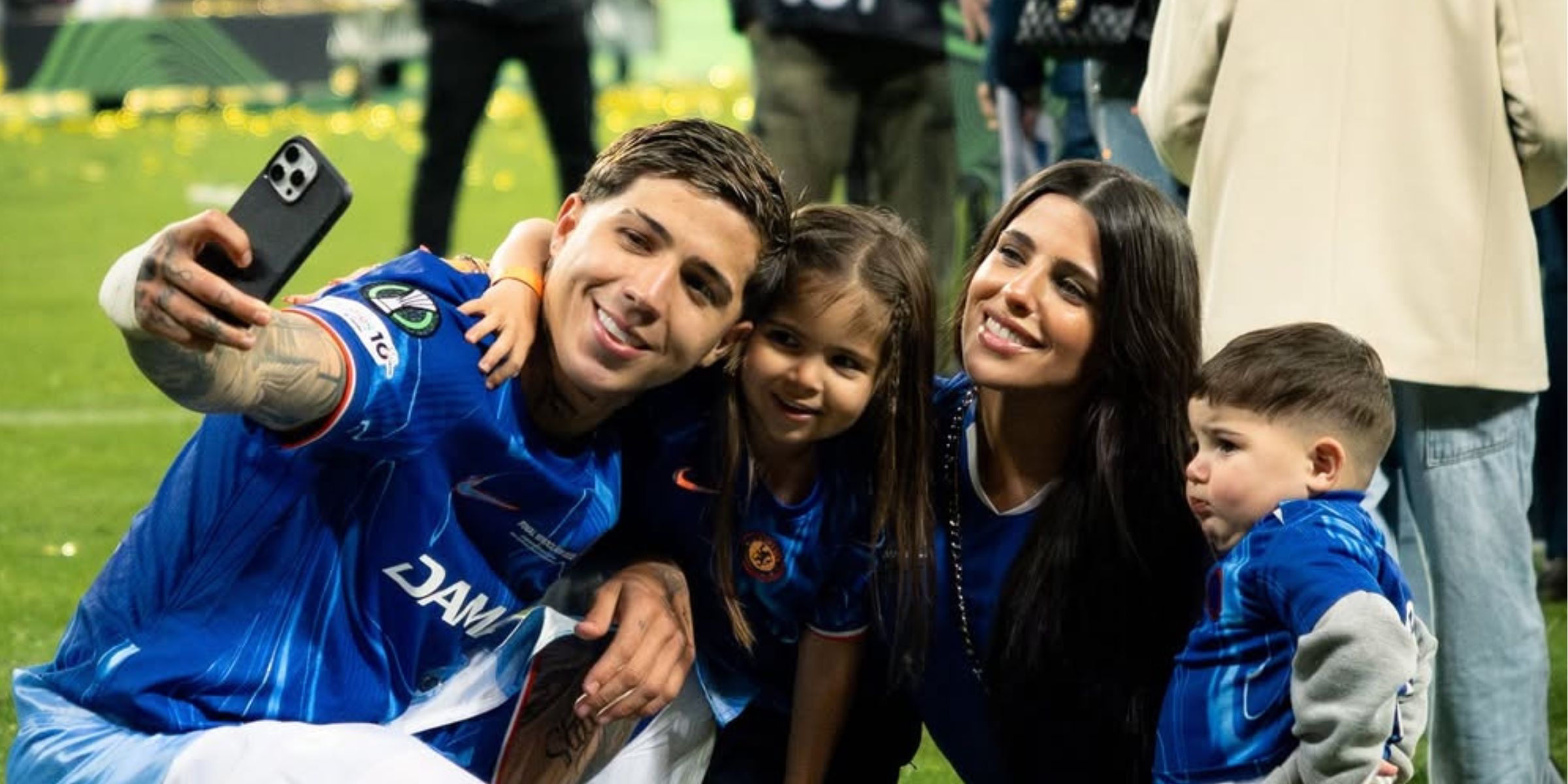 En registros audiovisuales publicados en las plataformas digitales, se pudo observar a Enzo Fernández frente a las gradas en los momentos previos al partido. El futbolista sostenía a su hijo menor, Benja, en brazos mientras tomaba la mano de su hija mayor, Olivia, para caminar por el césped.